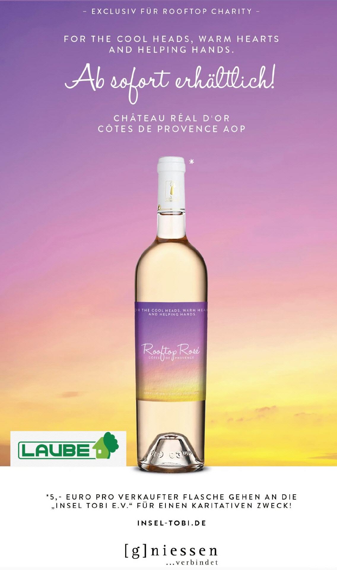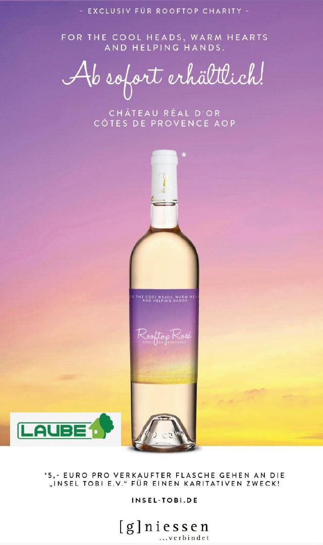 G.Niesen spendet 5,- Euro pro verkaufter Flasche in der Laube und die Laube spendet pro verkaufter Flasche 4,90 Euro. Diese 9,90 Euro gehen direkt an den Verein „Insel Tobi e.V.“ zur Unterstützung karitativer Projekte.